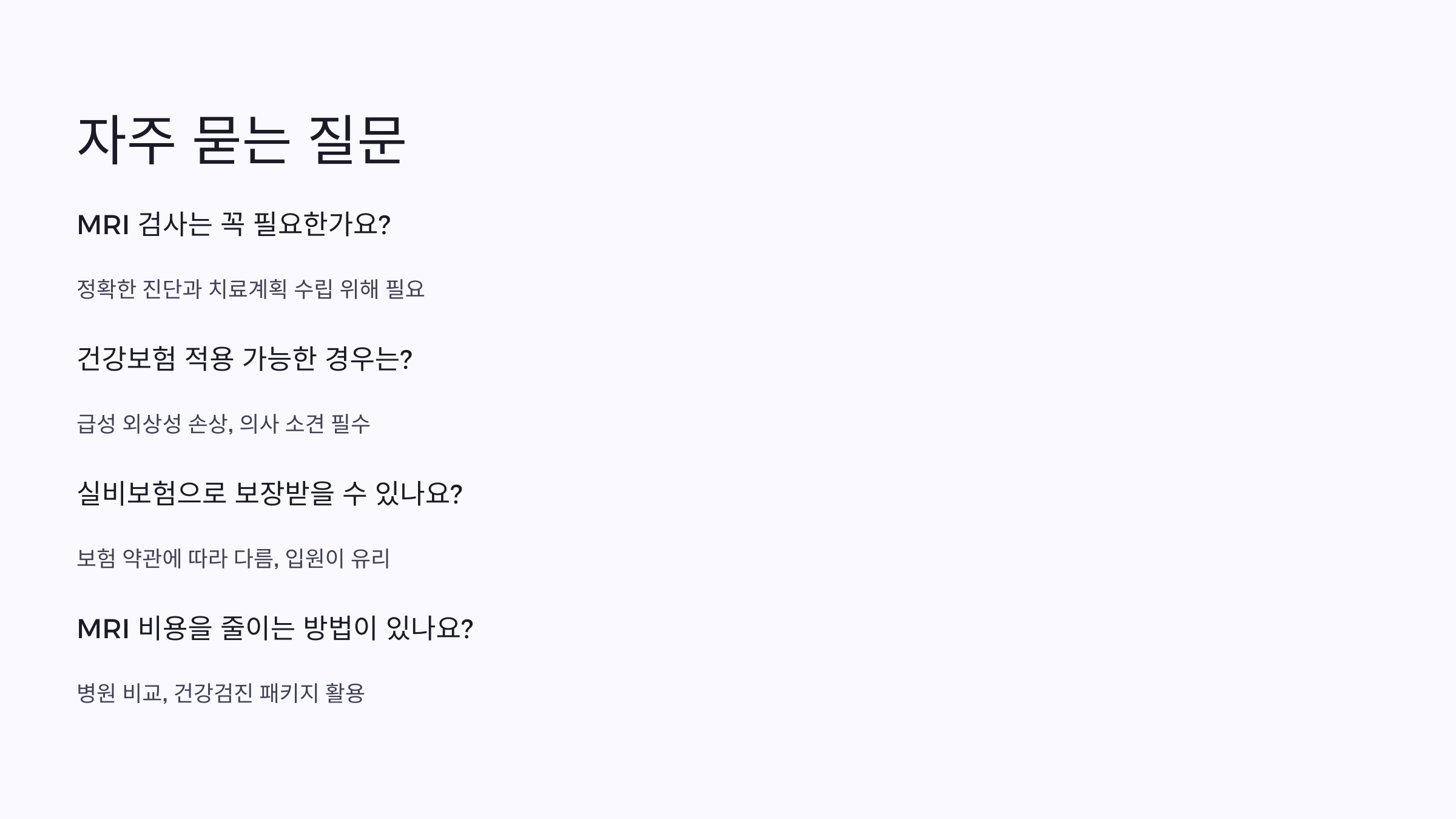 5세대 실손 ‘부지급 기준’ 손질…MRI 제외·신의료기술 포함2025 MRI 보험 이야기: 부위별 혜택과 입원 팁코로나19 선별진료소 찾기“모르는 사람만 호구”…MRI 비용 3배 납부, 알고 보니"年2조 새는 돈 막자"… 도수치료 자기부담률 30%→90%로생로병사의 비밀, 전국 400만 명 퇴행성 관절염…무릎 통증의 해법은